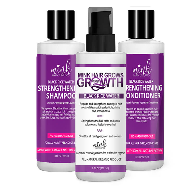 - Black Rice Water Conditioner (8 oz) – A protein-packed formula that detoxes the scalp, strengthens follicles, and restores damaged strands with deep hydration and a lustrous shine.
